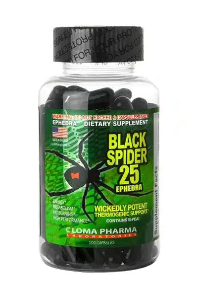 بلاك سبايدر ٢٥ إيفيدرا (١٠٠ قرص) يستخدم لدعم فقدان الوزن وتعزيز الطاقة ، وتعزيز عملية الأيض ، مُصمَّم من قِبل شركة كلوما فارما.